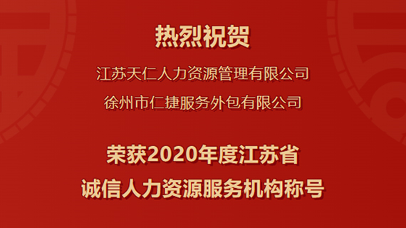 - 熱烈祝賀江蘇天仁人力資源管理有限公司、徐州市仁捷服務(wù)外包有限公司榮獲“2020年度江蘇省誠(chéng)信人力資源服務(wù)機(jī)構(gòu)稱號(hào)”!